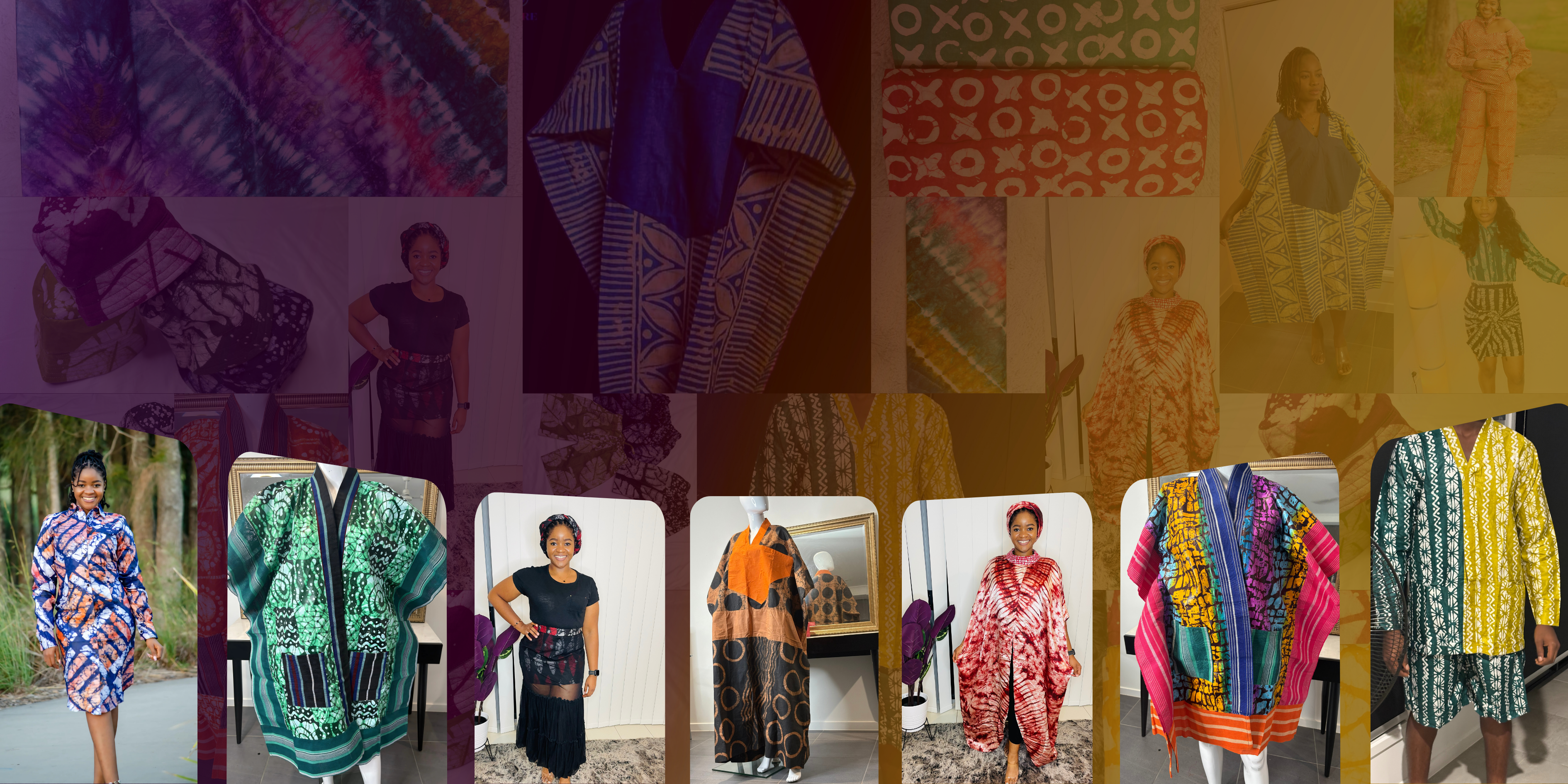 Handcrafted Adire fabrics and sewn outfits for women, men, and kids.